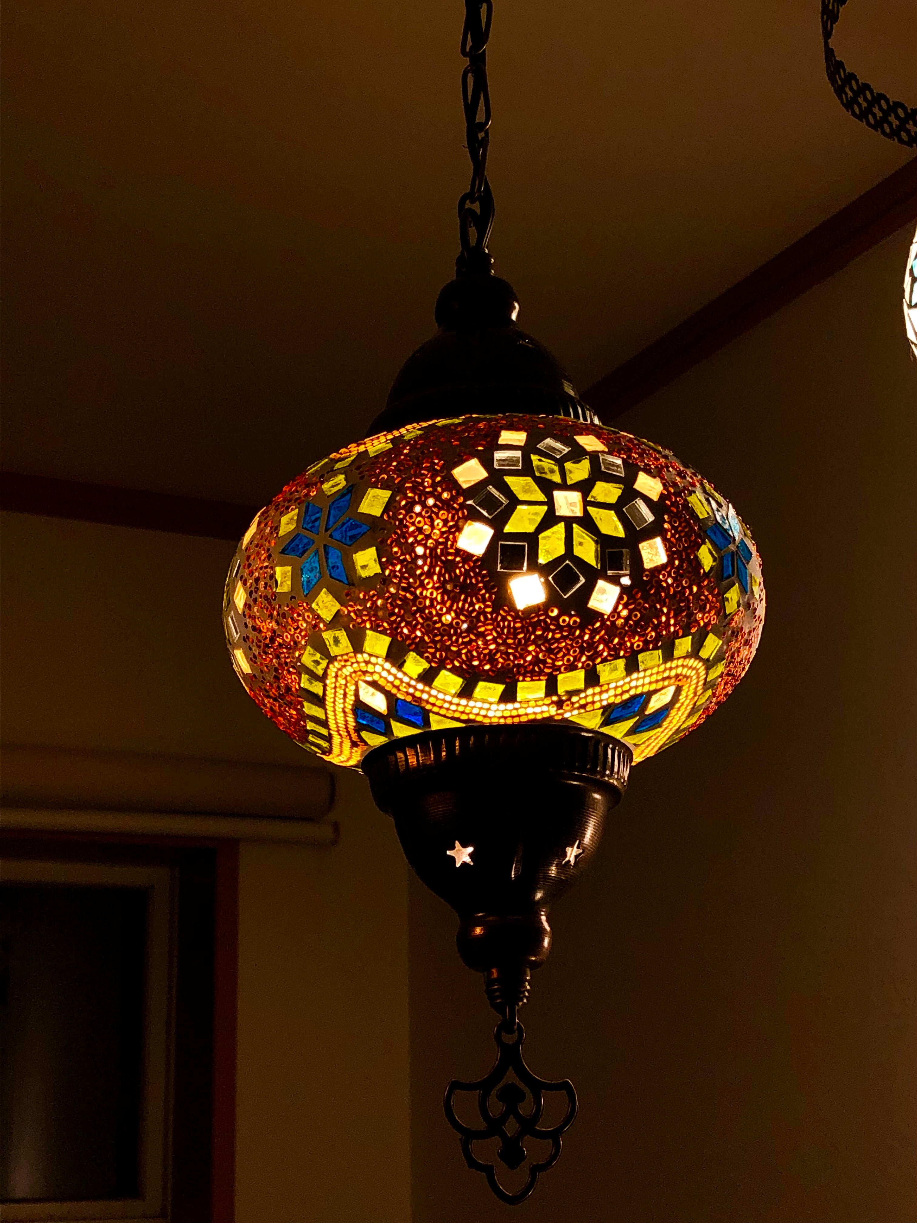 1本のチェーンで吊り下げられるスッキリしたランプ。大きめのランプシェード(Lサイズ幅約19cm)がゴージャス。シックな落ち着いた色合いでとても美しいランプです...幻想的な灯火がお部屋をオリエンタルな雰囲気を演出してくれます♡