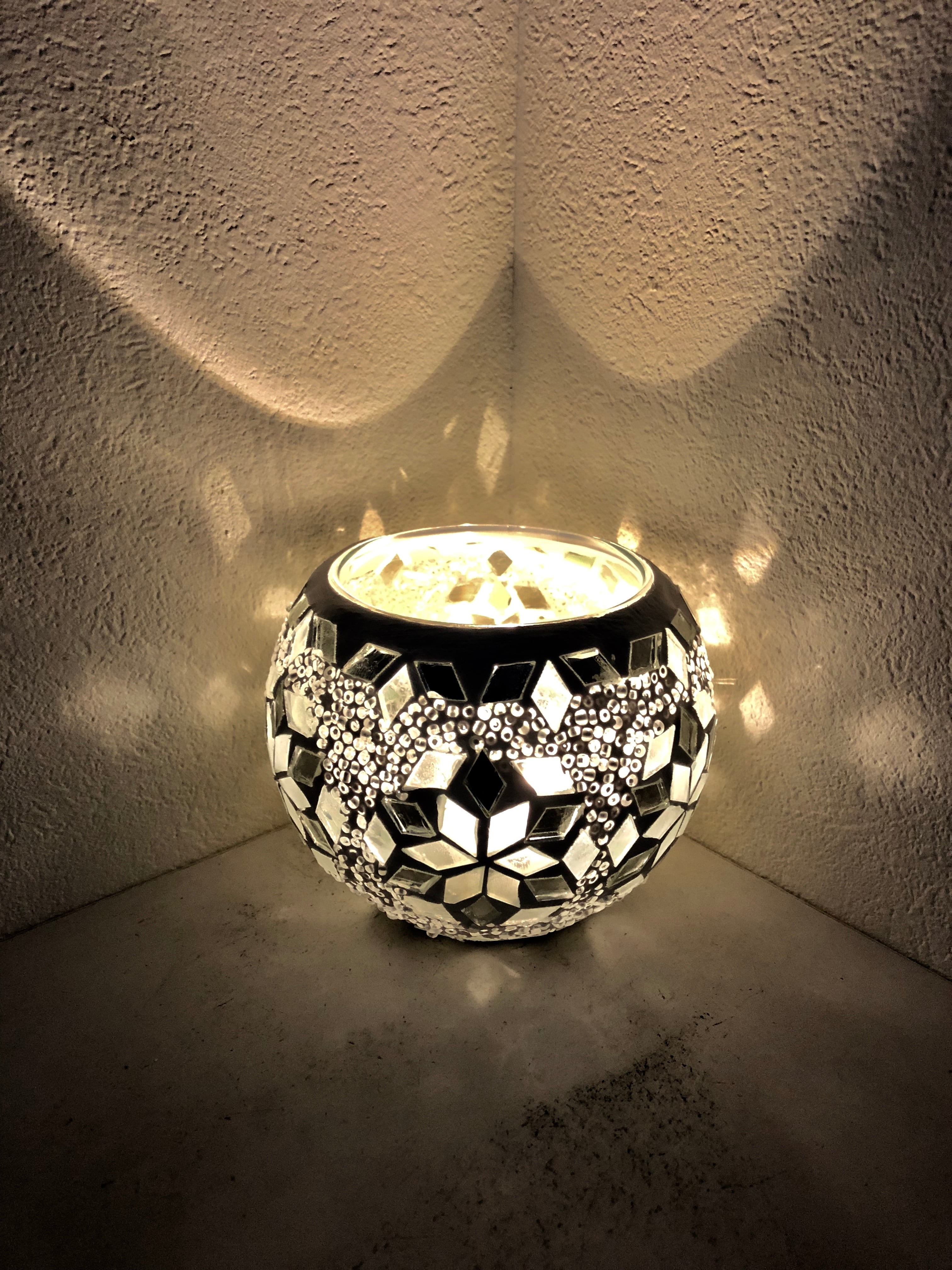 クリアのガラスタイルメインで制作しました。クリアというよりくもりガラス・磨りガラスっぽく、ガラスタイルと粒ビーズから漏れる灯火は柔らかな優しい灯火です。場所を選ばずどんなお部屋にもマッチするかと。点灯しなくてもインテリアとしてオシャレです。点灯すると優雅で幻想的な灯火がとても美しいです♡ロウソクのゆらゆらとした灯火にとても癒されます...