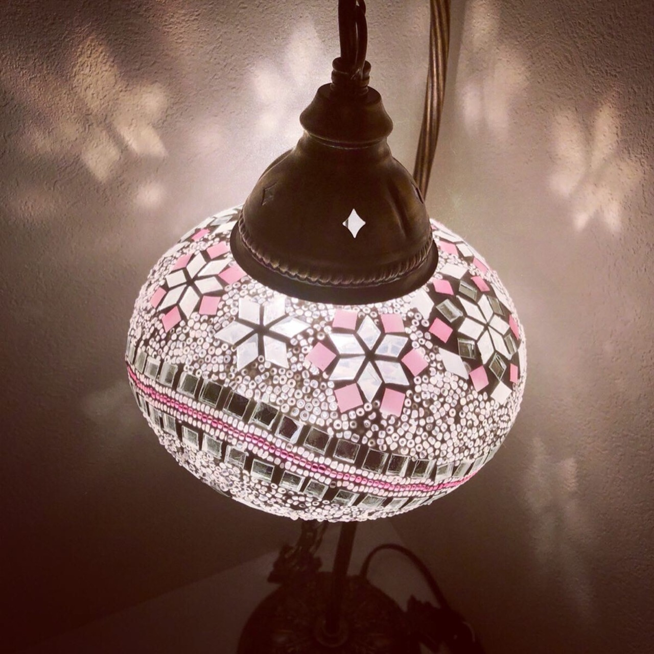 ユニークな形のトルコモザイクランプです。大きめのランプシェード(Lサイズ幅約19cm)にクリアとピンク色で可愛らしく仕上げました。オリエンタルな雰囲気でありながらエレガントさもあるランプです。幻想的な灯火をお楽しみください。