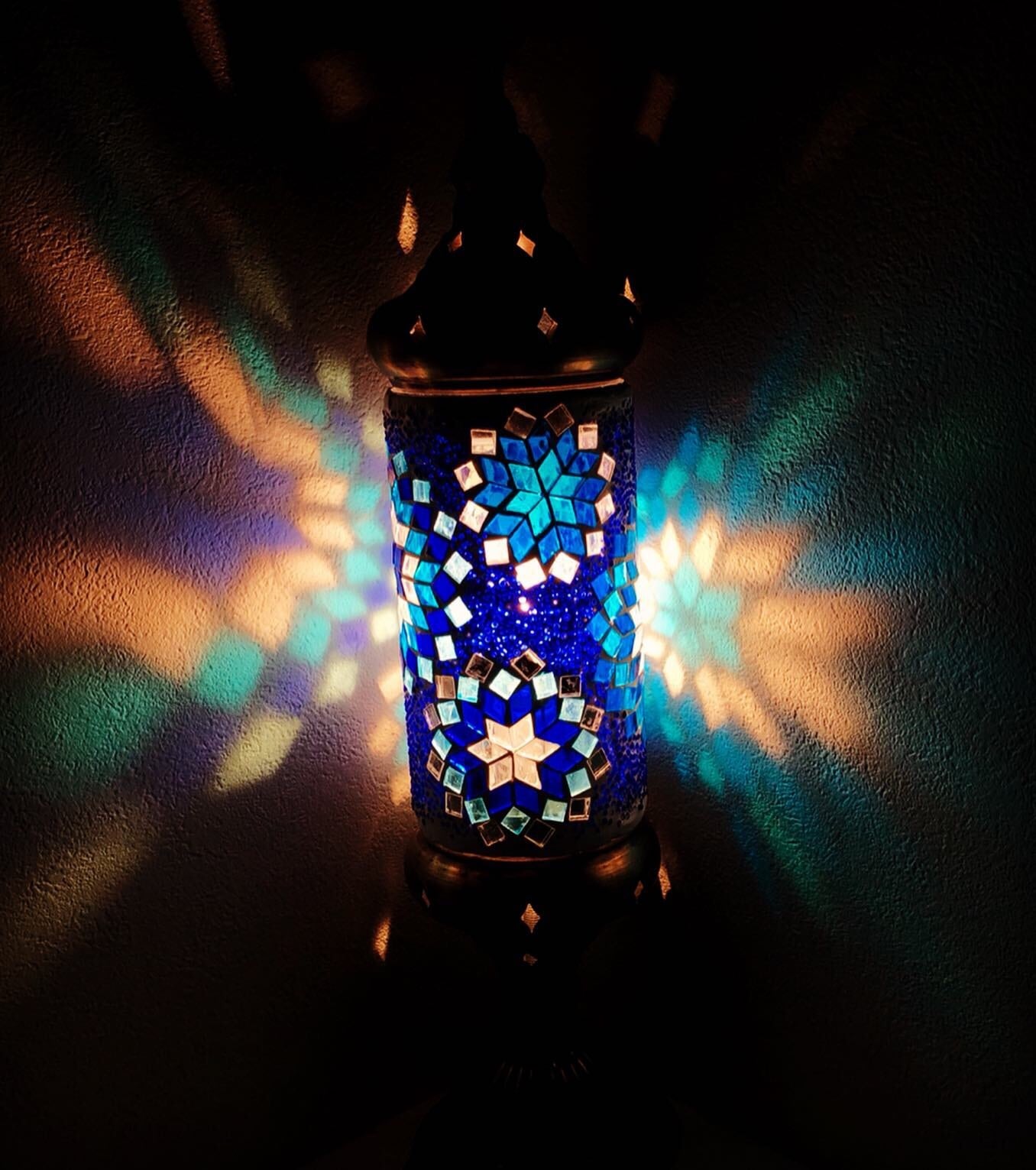 スッキリとしたスタイルの筒型スタンドタイプ。爽やかなブルー系ですが、伝統的なデザインがとっても温かみがあり灯るとオリエンタルな雰囲気で素敵なランプの完成です。スッキリと心を落ち着かせてくれます♡