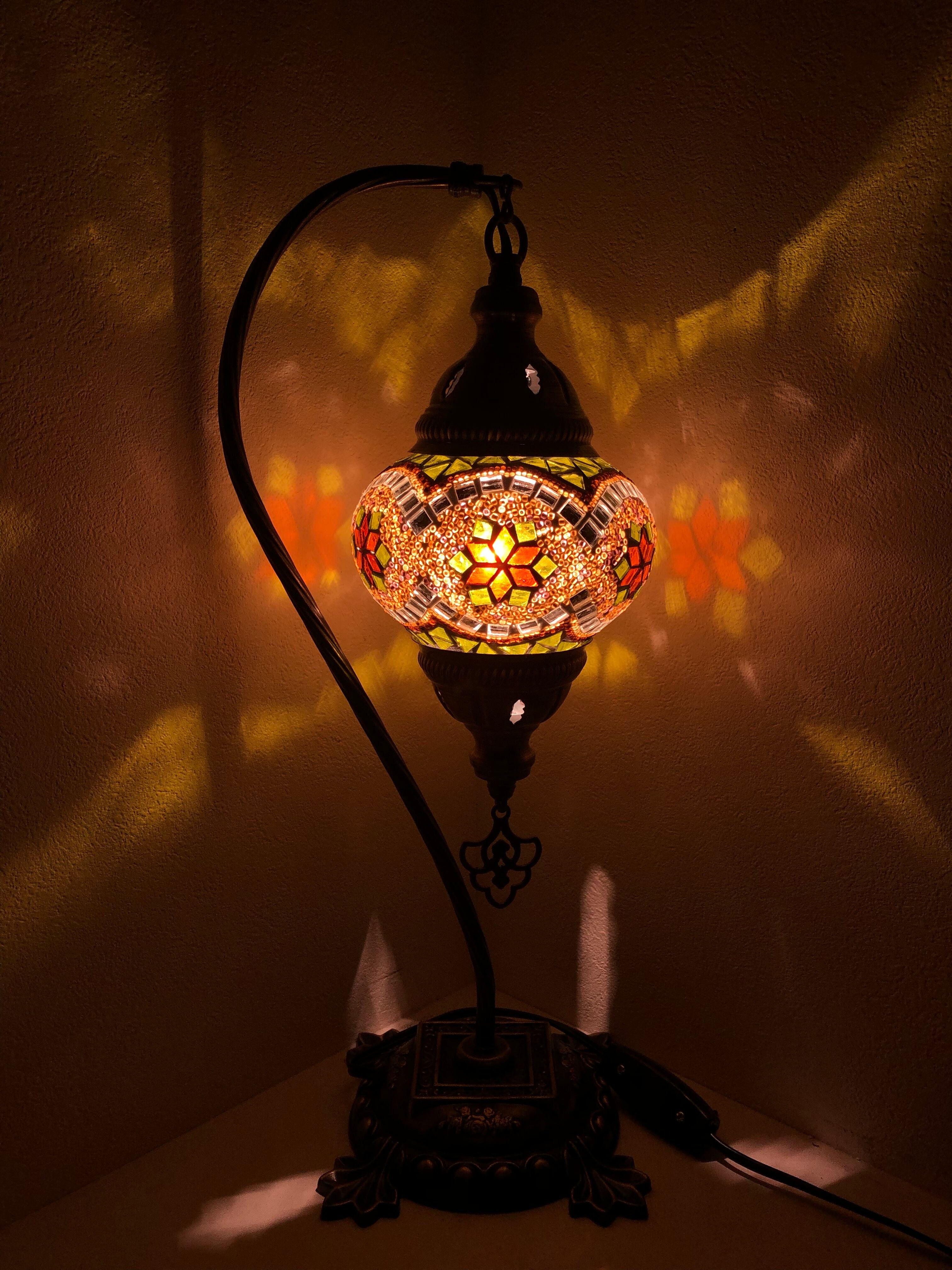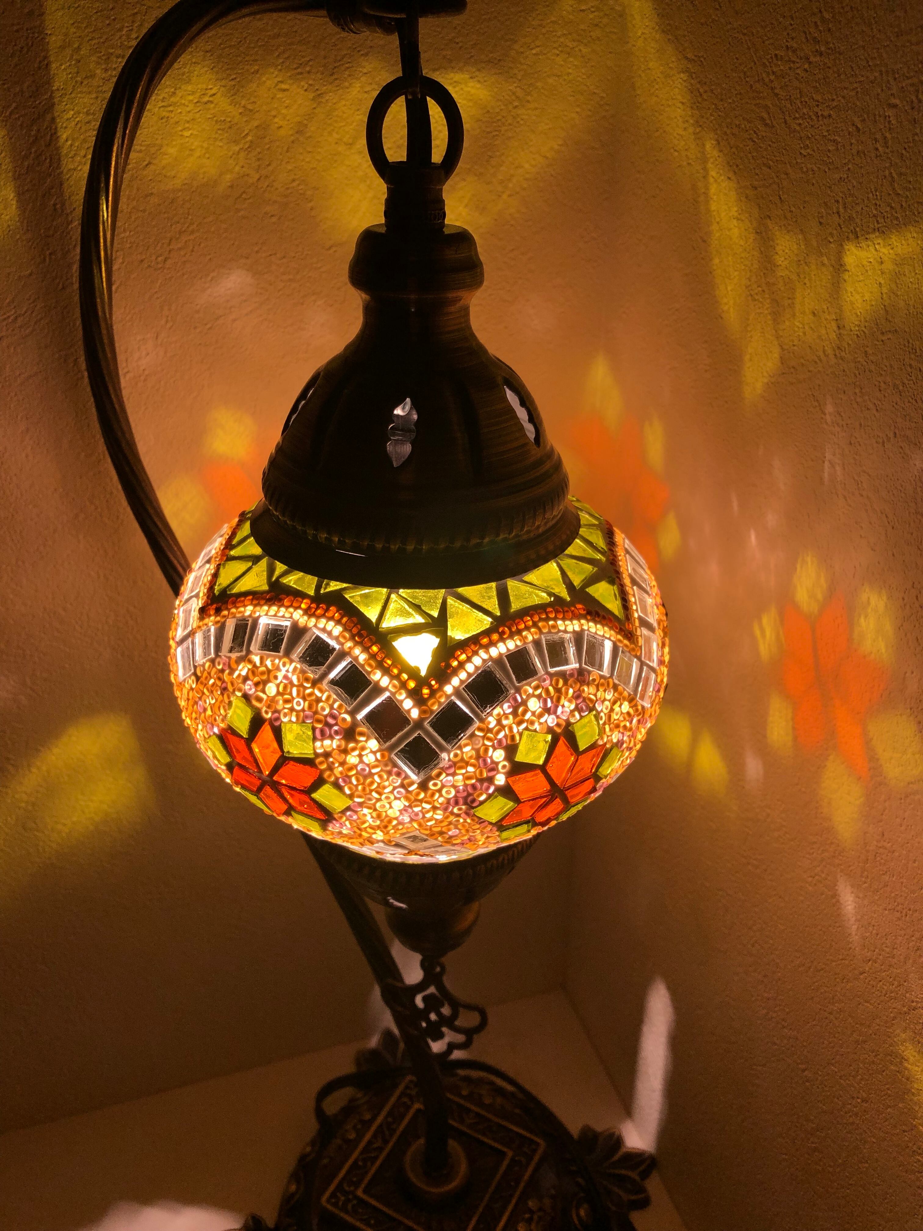 ユニークな形のトルコランプ。秋っぽく...と制作しましたが、こんなに可愛らしいモザイク感たっぷりのトルコランプが完成しました。落ち着いた色合いですがデザインが可愛らしく温かみのある作品です。点灯していなくてもゴージャスでインテリアとしてもオシャレです。エキゾチックな雰囲気をお楽しみいただけます。是非トルコランプの世界観をお楽しみください♡