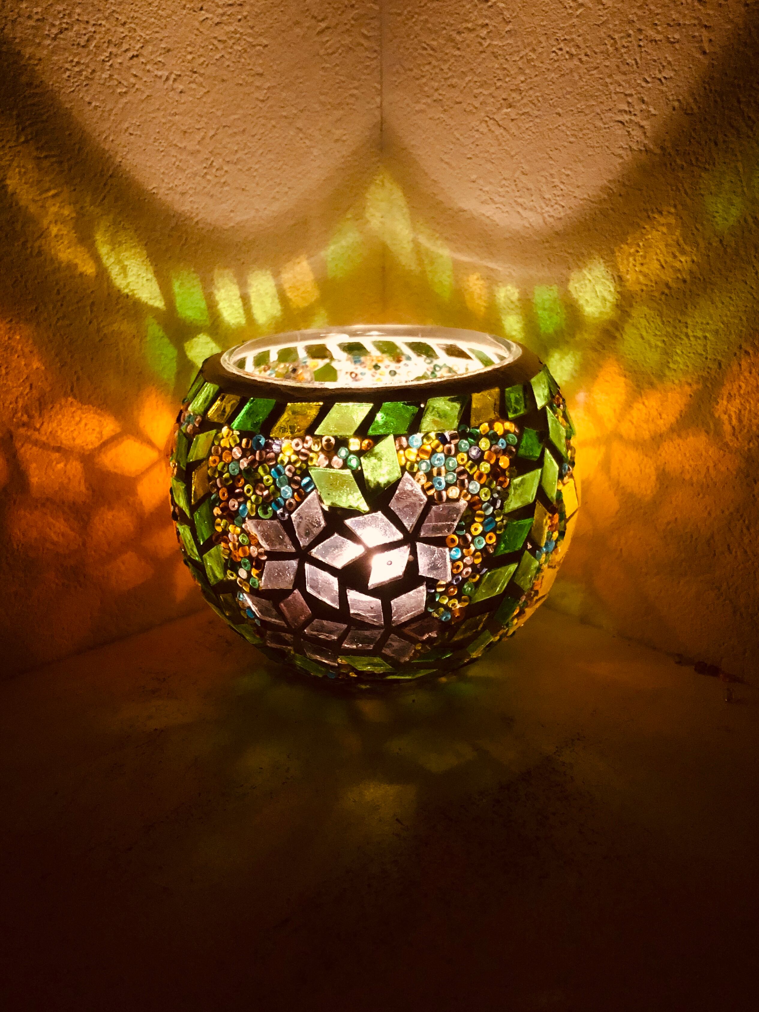 お花畑のように鮮やかなお花をたくさん入れてみました。色とりどりのガラスタイル・ビーズから漏れる灯火がとても美しい作品です。画像1、2、3、4枚目は電球スタンドを使用、画像5枚目はロウソクを使用しております。