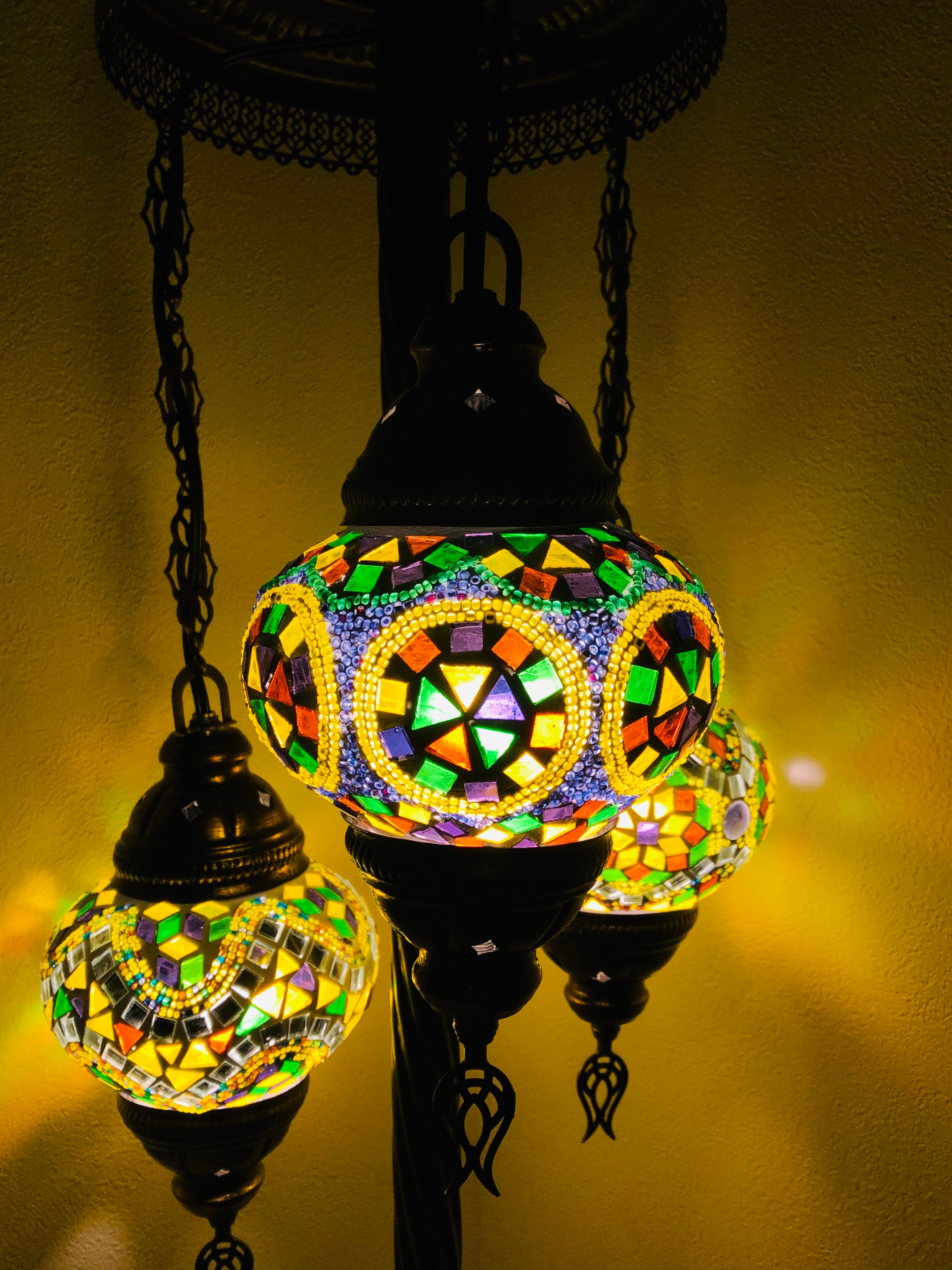 直径16cmのランプが3灯。カラーを統一しデザインを変えて制作。可愛いデザインをガラスタイルいっぱいでオリエンタルムード満点。お部屋を可愛らしく演出してくれますよ。こちらの3つの作品は単品でもお譲りします。お気に入りのランプをお気に入りの金具(吊るし1本チェーンペンダントランプ・スタンドランプ・スワンネックランプ・アラジンランプ)に取り付け可能です。また、3灯シャンデリアに付け替える事も可能です。お気軽にお問い合わせください。