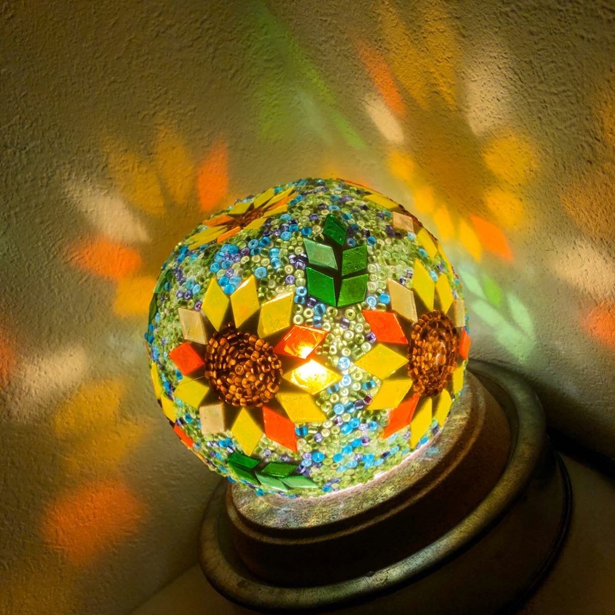 らんぷやさん人気の向日葵キャンドルホルダー。向日葵をたくさん入れて制作。温かみがあって可愛い作品です♡電球スタンドを使用して(画像1、2、3枚目)鮮やかな灯火も良し、ロウソクを使用して(画像4枚目)揺ら揺らと幻想的な灯火も良し...色々なご使用方法でお楽しみください。
