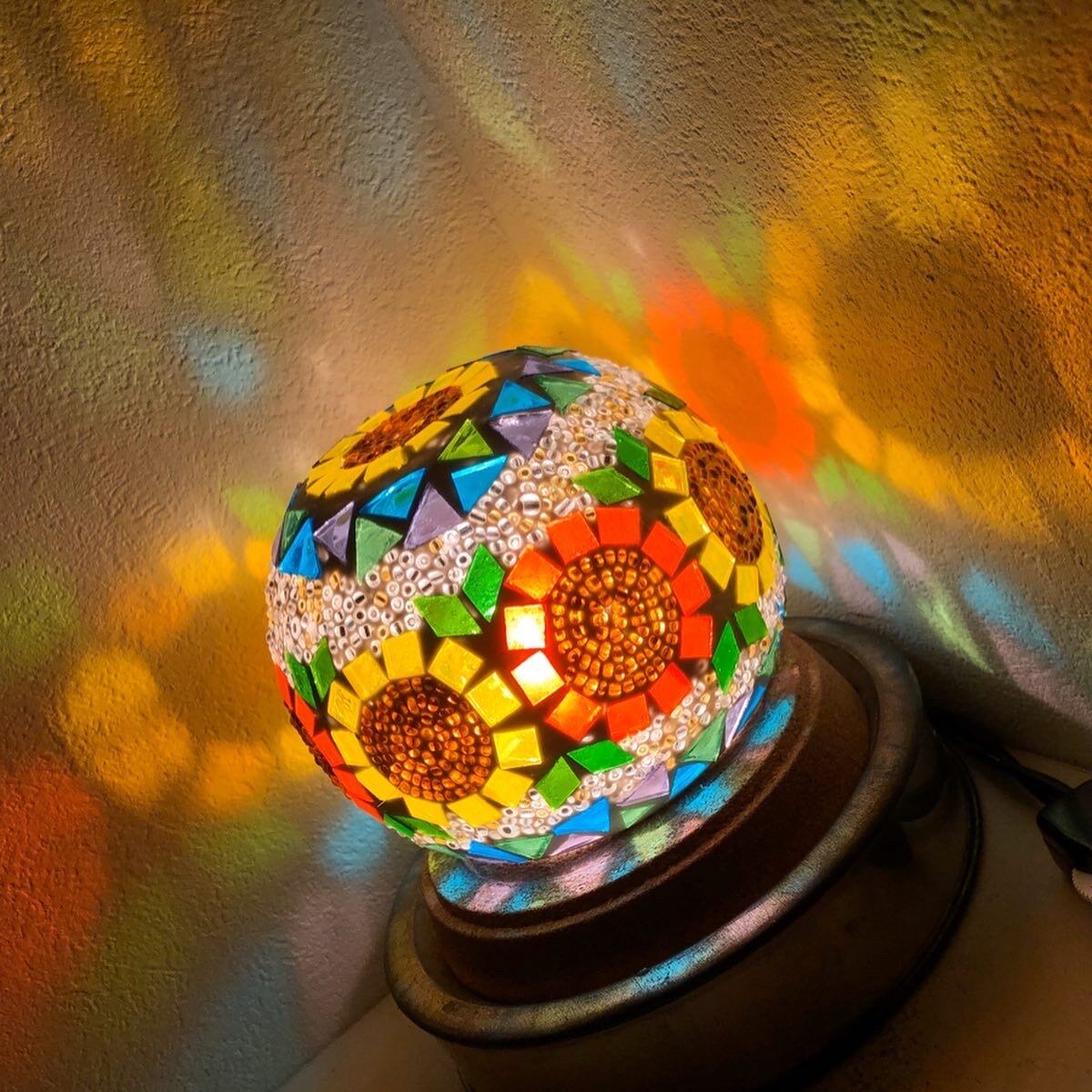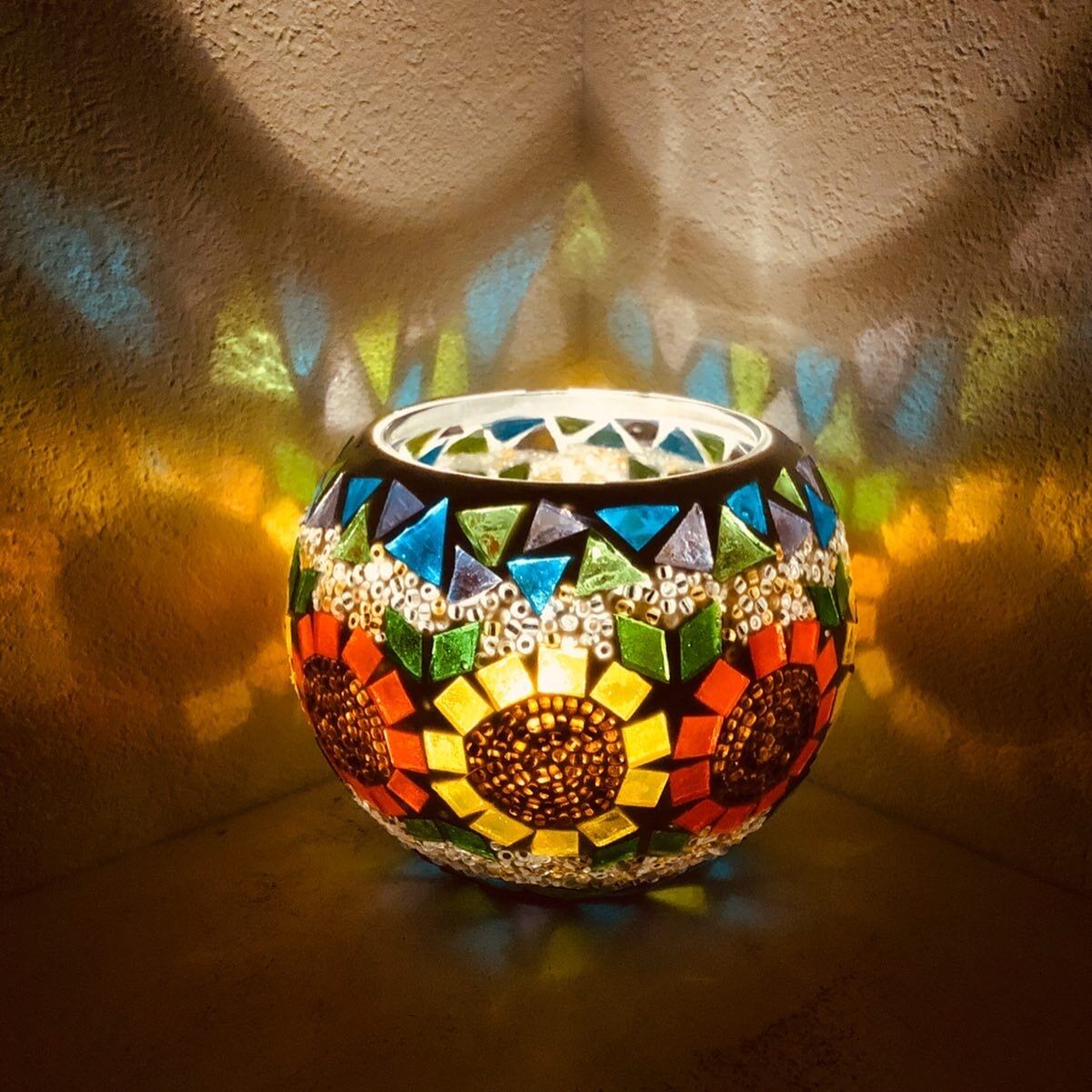 らんぷやさん人気の向日葵キャンドルホルダー。モザイク感たっぷりの向日葵キャンドルホルダーも可愛いですね♡電球スタンドを使用して(画像1、2、3枚目)鮮やかな灯火も良し、ロウソクを使用して(画像4枚目)揺ら揺らと幻想的な灯火も良し...色々なご使用方法でお楽しみください。