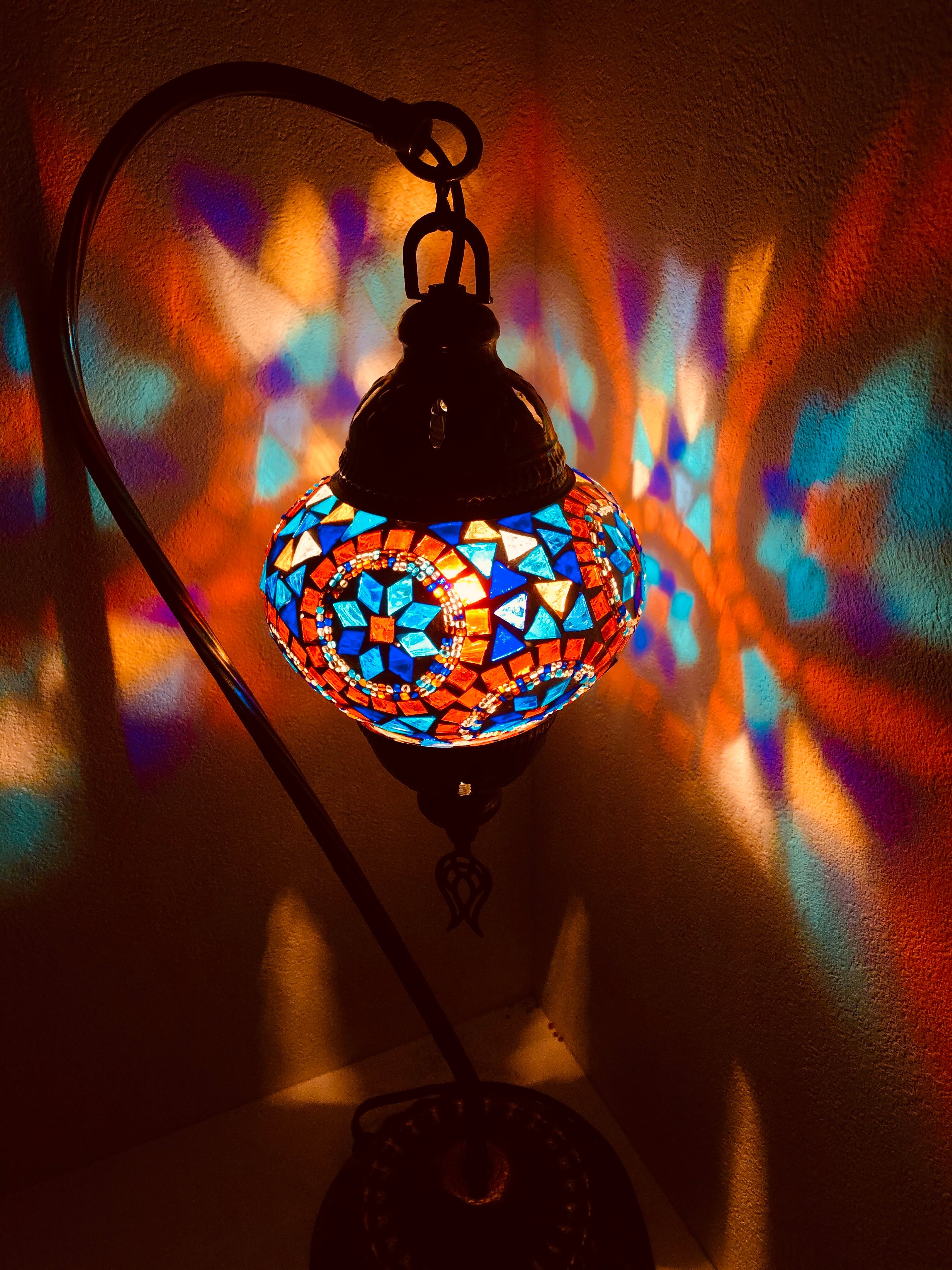とてもオリエンタルな雰囲気の水差し型のランプ。鮮やかのブルーとシックなブラウンでアンティーク調のランプが完成しました。点灯していなくても可愛らしくインテリアとしてもオシャレです。点灯すると幻想的な灯りが落ち着いた優しい空間を作り出します。是非トルコランプの世界観をお楽しみください♡