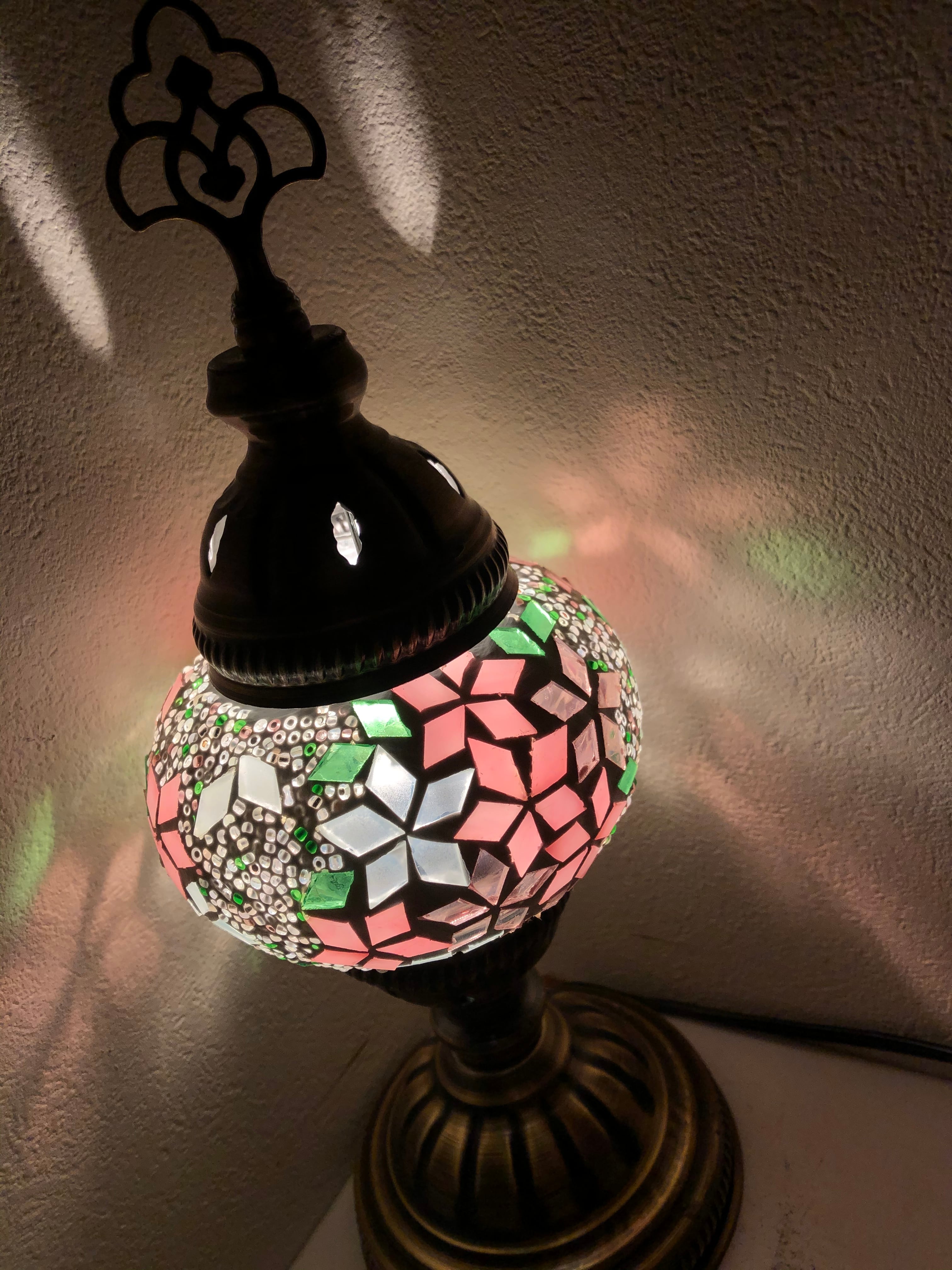 らんぷやさんで人気の“桜ランプ”。『スタンドランプを見てみたい』とのお問い合わせを頂き作ってみました。今回はSサイズで制作。大きなサイズでもお作りします。ピンク色の可愛らしい桜...ガラスタイルから溢れる灯火も壁に映し出される灯火もとても可愛らしいです。トルコモザイクランプの世界観をお楽しみください♡