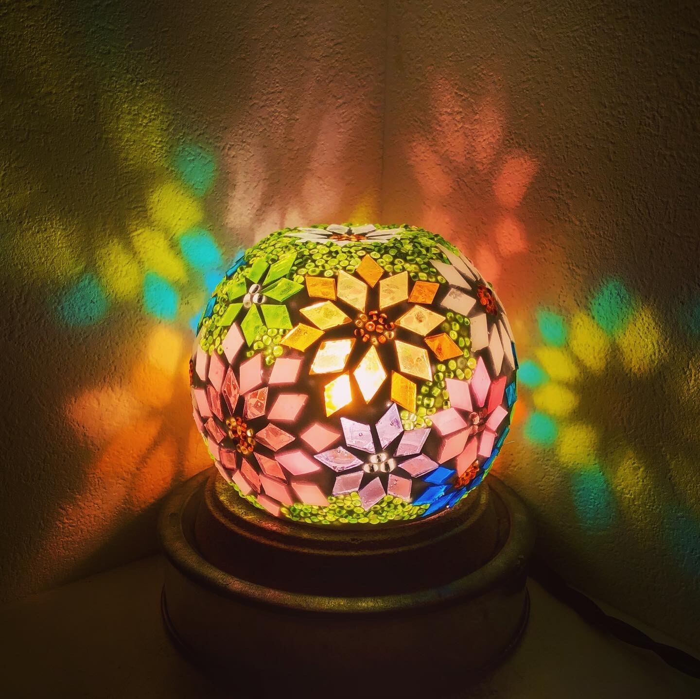 お花をたくさん入れて制作しました。どの向きどの角度からも可愛らしいお花が見られます。優しい色合いの柔らかな灯火をお楽しみください♡画像6枚目は電池式LEDティーライトを用いた灯火です。