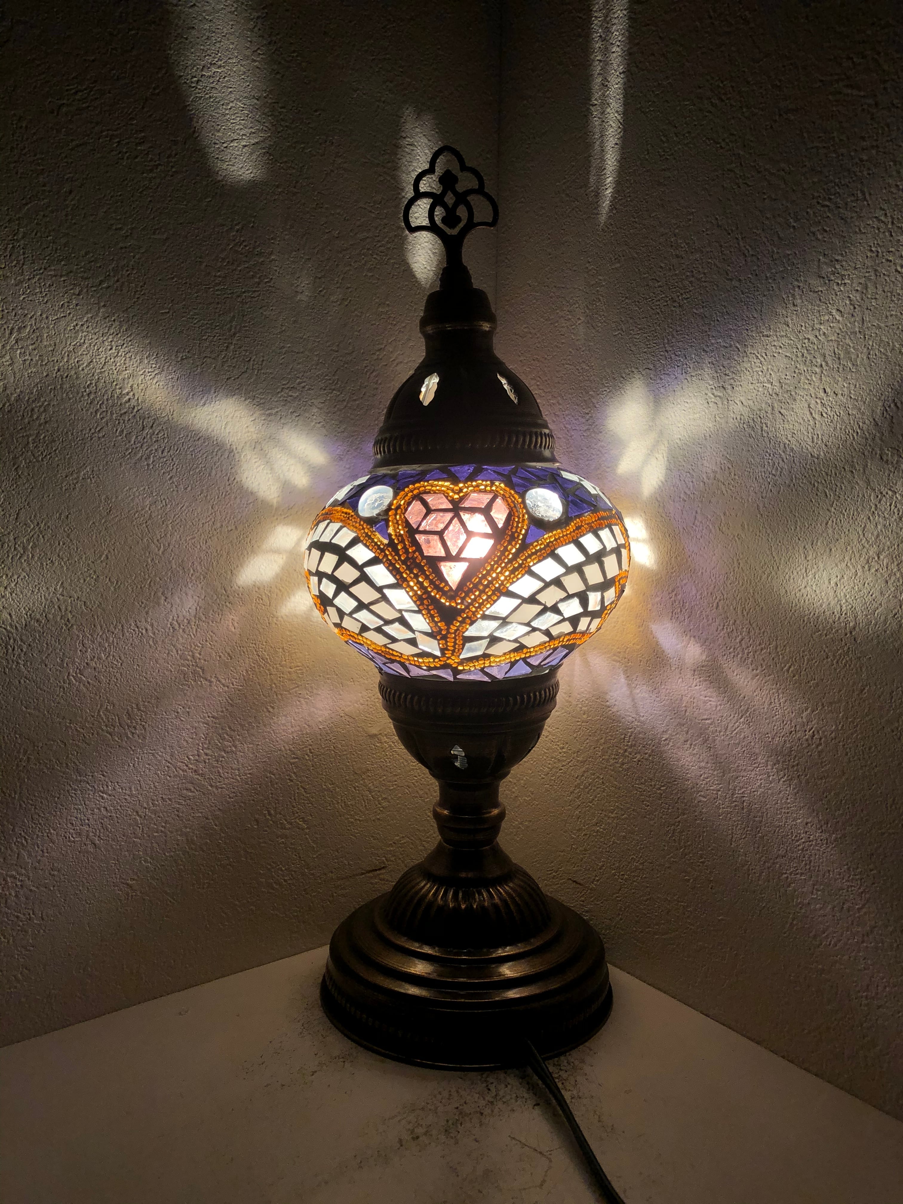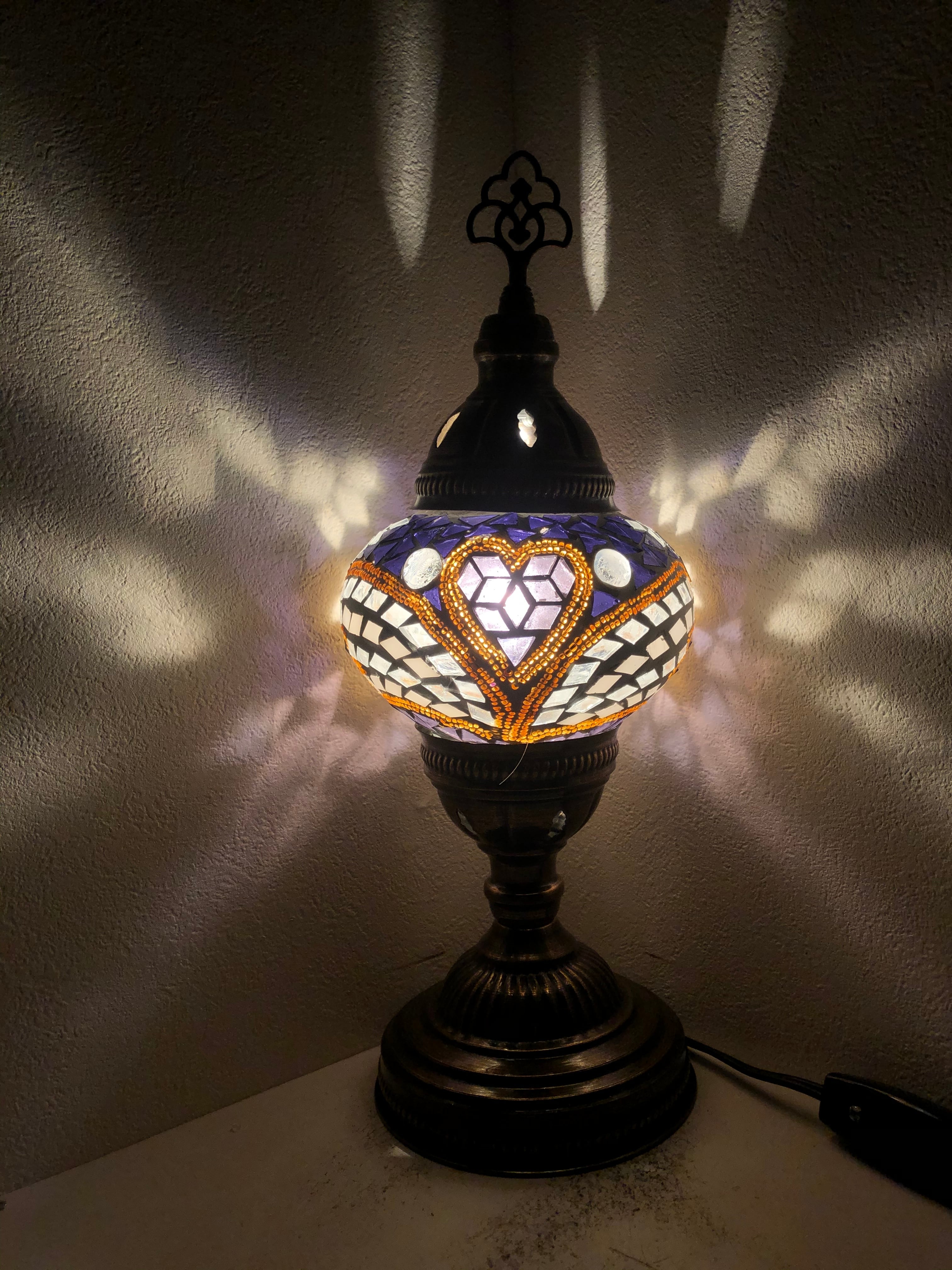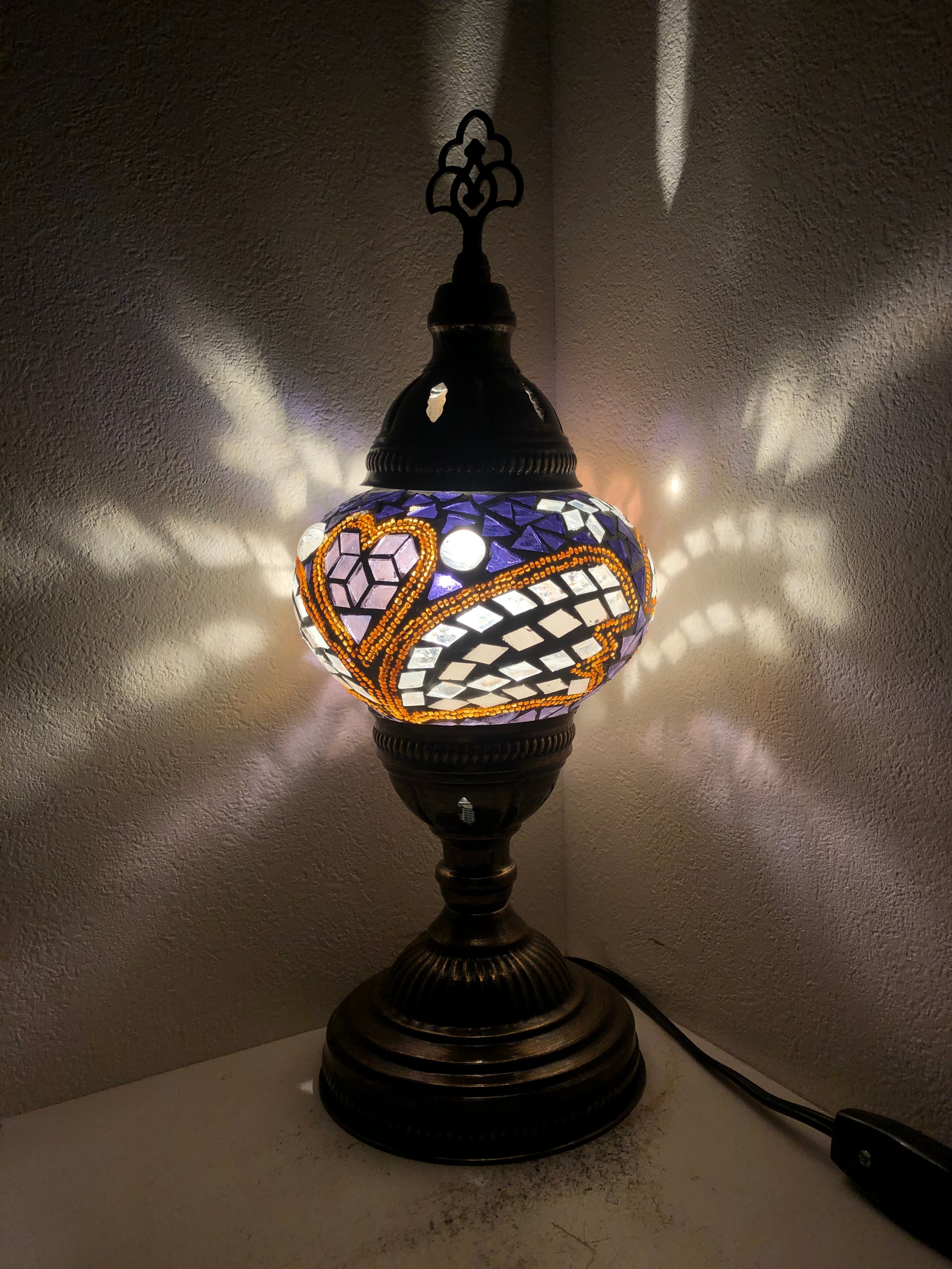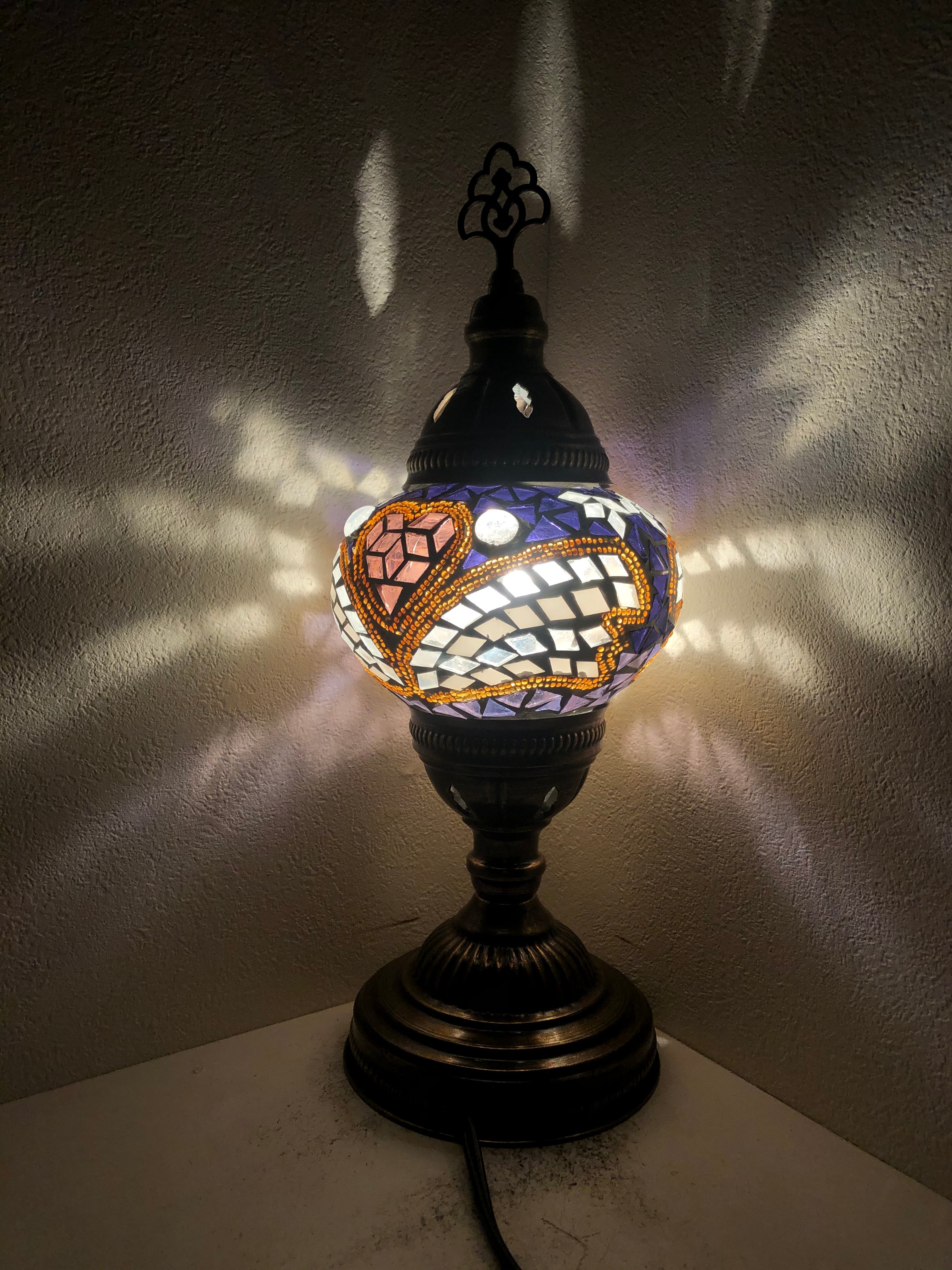 天使の羽シリーズ①...モザイクランプで表現したらどんな感じ?試行錯誤しながら制作してみました。深みのあるシックなパープルで仕上げました。アラジンランプやスワンネックスタンドランプにしても素敵だと思います。スタンドタイプは場所を取らずお好きな場所でお楽しみ頂けます。点灯すると幻想的な灯りがオリエンタルな空間を作り出します。是非トルコランプの世界観をお楽しみください♡