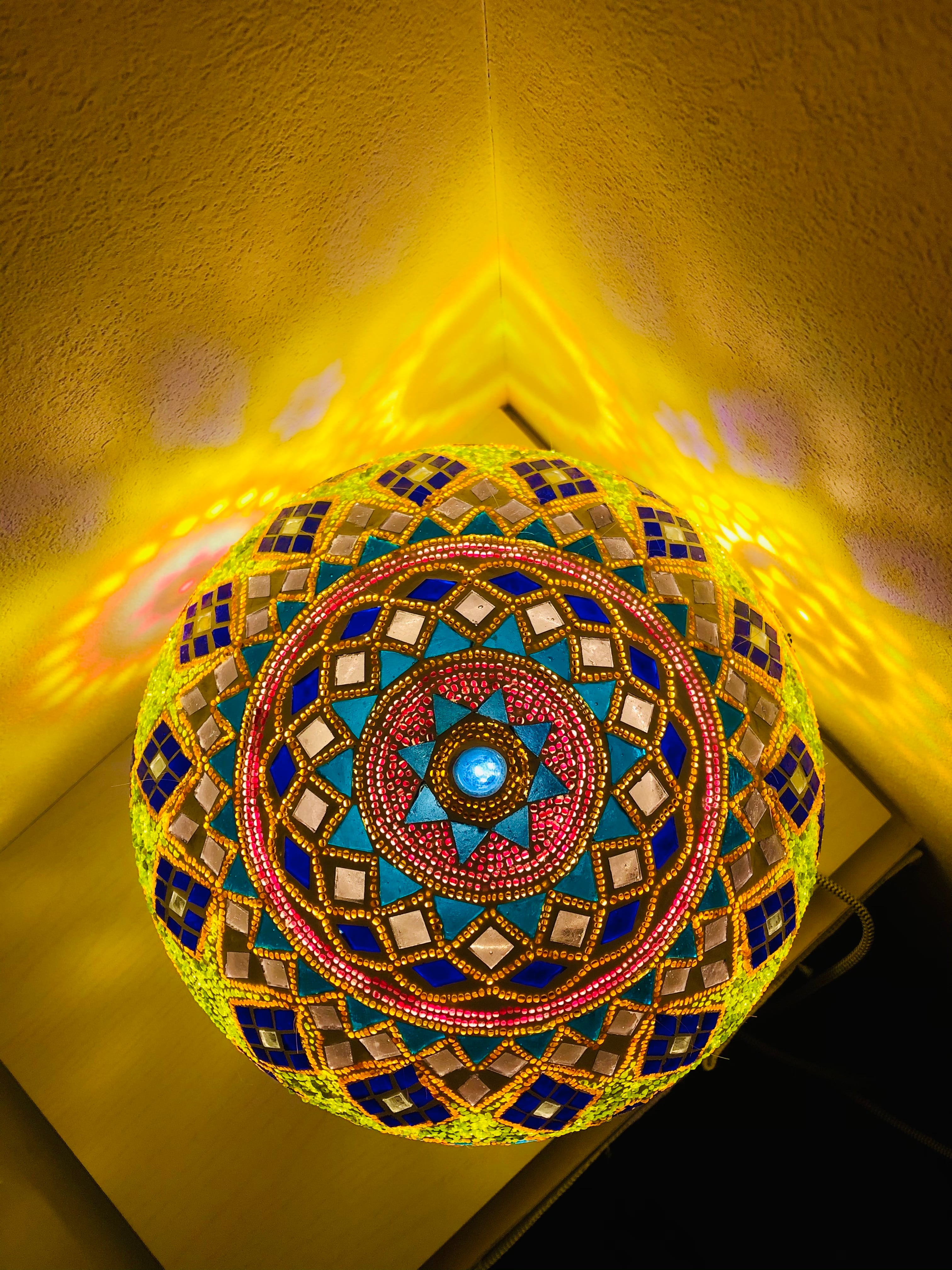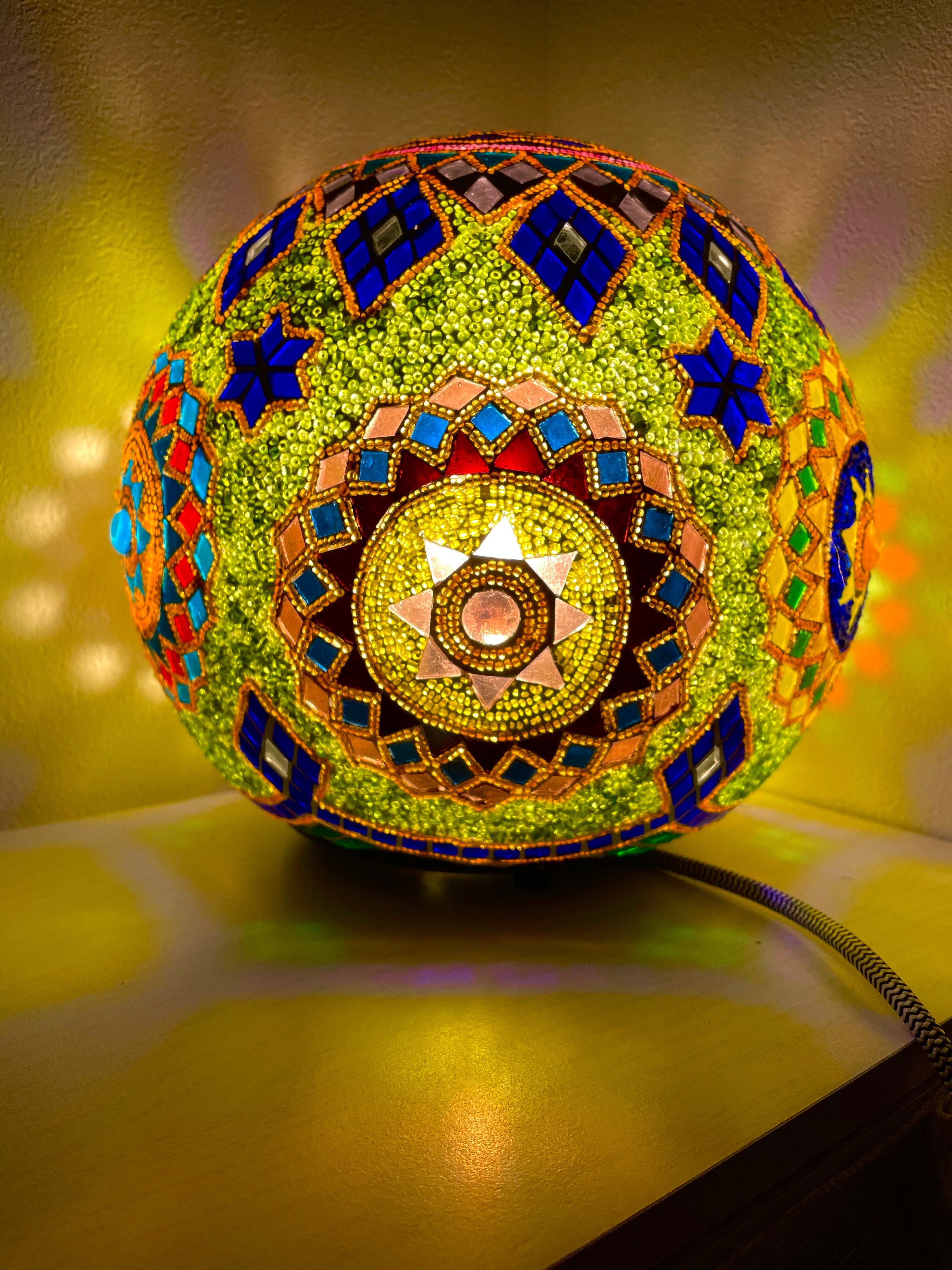 とても大きなサイズの丸型ランプ。フロアへ置いても良し、テーブルやカウンターへ置いても良し。迫力あるサイズです。曼荼羅のような細かなデザイン、鮮やかな色合いが美しい作品です。細部にまでこだわり制作しました。オリエンタルな雰囲気、ゴージャスな灯火をお楽しみください。