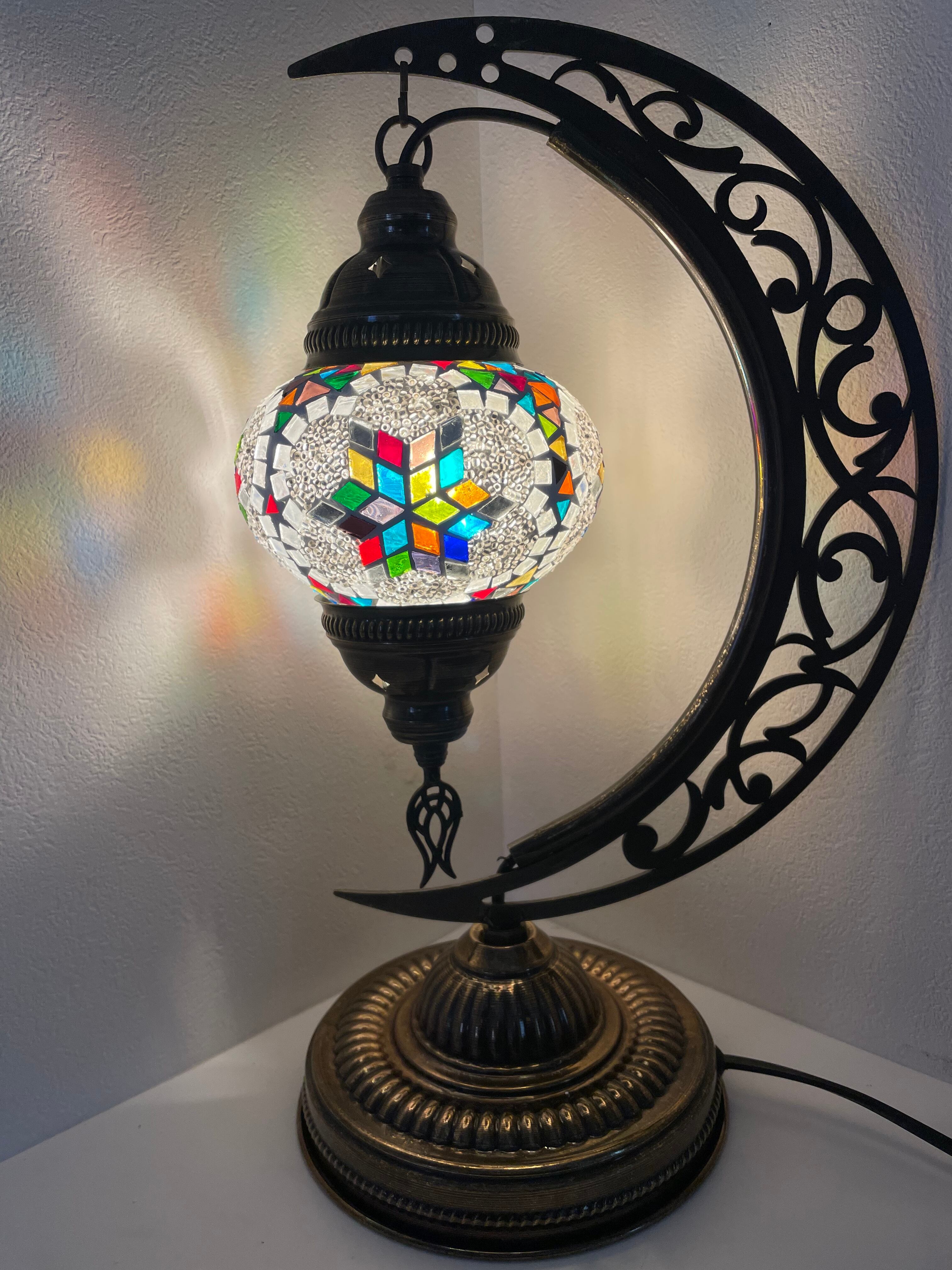 エキゾチックな月型フレームにモザイクランプがゆらゆらと揺れる可愛らしいデザイン。幻想的な灯火とエキゾチックなフレームがとてもゴージャスです。まるでステンドグラスのようなカラフルな色使いで美しく、ユルドゥズ柄のランプはトルコ感満載です⭐︎