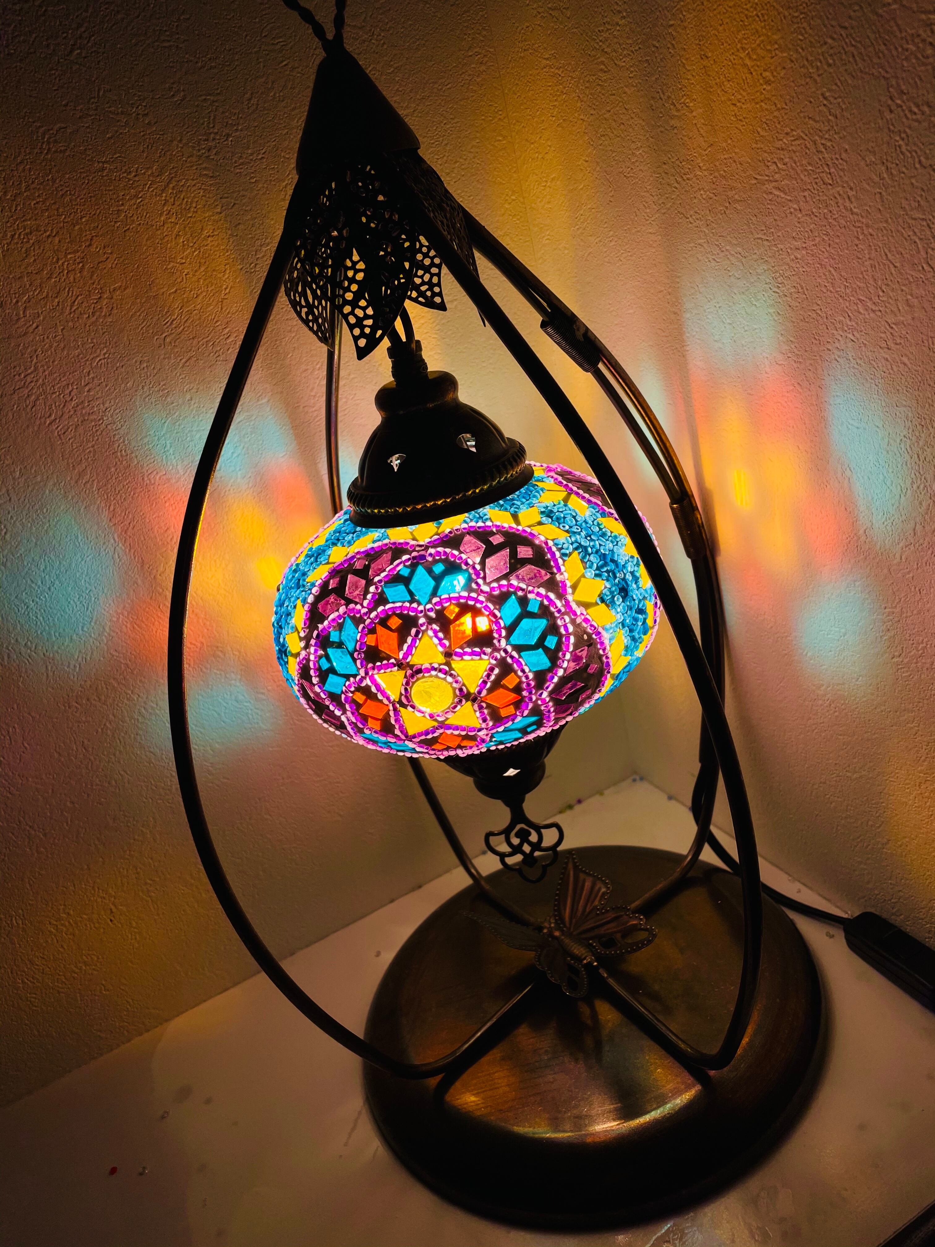 大きなLサイズ(直径約19cm)で色鮮やかなランプを作ってみました。こちらのフレームはとても繊細なデザインで台座には“蝶々”頭の部分に“葉”が施されております。大変珍しい金具です。おうちに篭りがちな今、お部屋も気分も明るくなるような作品になるよう心がけてみました。
