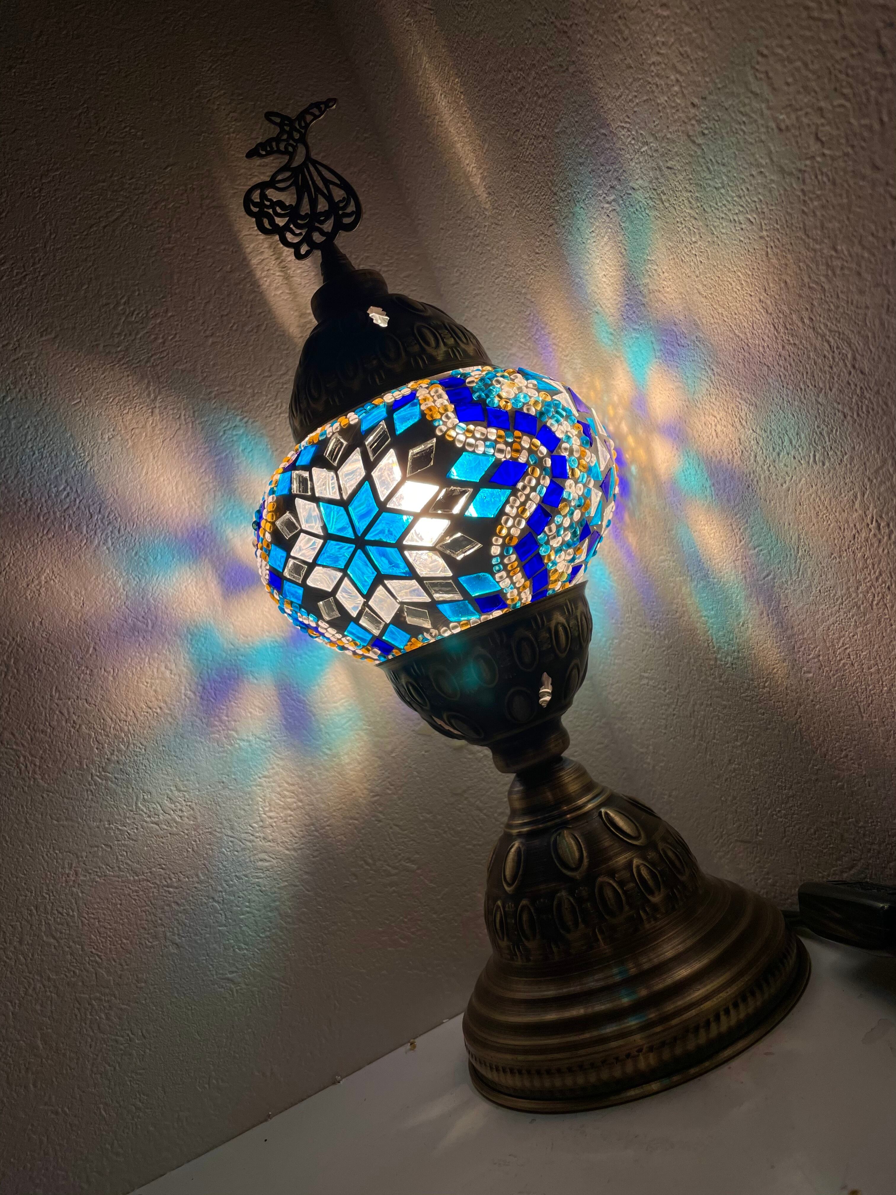 トルコのメヴラーナ旋回舞踏セマーをイメージした金具がトルコっぽくて可愛いスタンドランプです。この金具がとても人気でお問い合わせが多いので色々なランプにセットしてみました。こちらはお色も人気カラーでトルコブルー。煌びやかなゴージャスランプです。点灯していなくても可愛らしくインテリアとしてもオシャレです。点灯すると幻想的な灯りがオリエンタルな空間を作り出します。是非トルコランプの世界観をお楽しみください♡