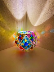 とにかくカラフルポップに仕上げました♡ガラスタイルもビーズも何色使ったでしょうか(^^)元気が出るキャンドルホルダーですよ!おうち時間をちょっとお洒落に過ごしてみませんか?画像1、2、3枚目は電球スタンドを使用し、画像4枚目は電池式LEDティーライト使用。