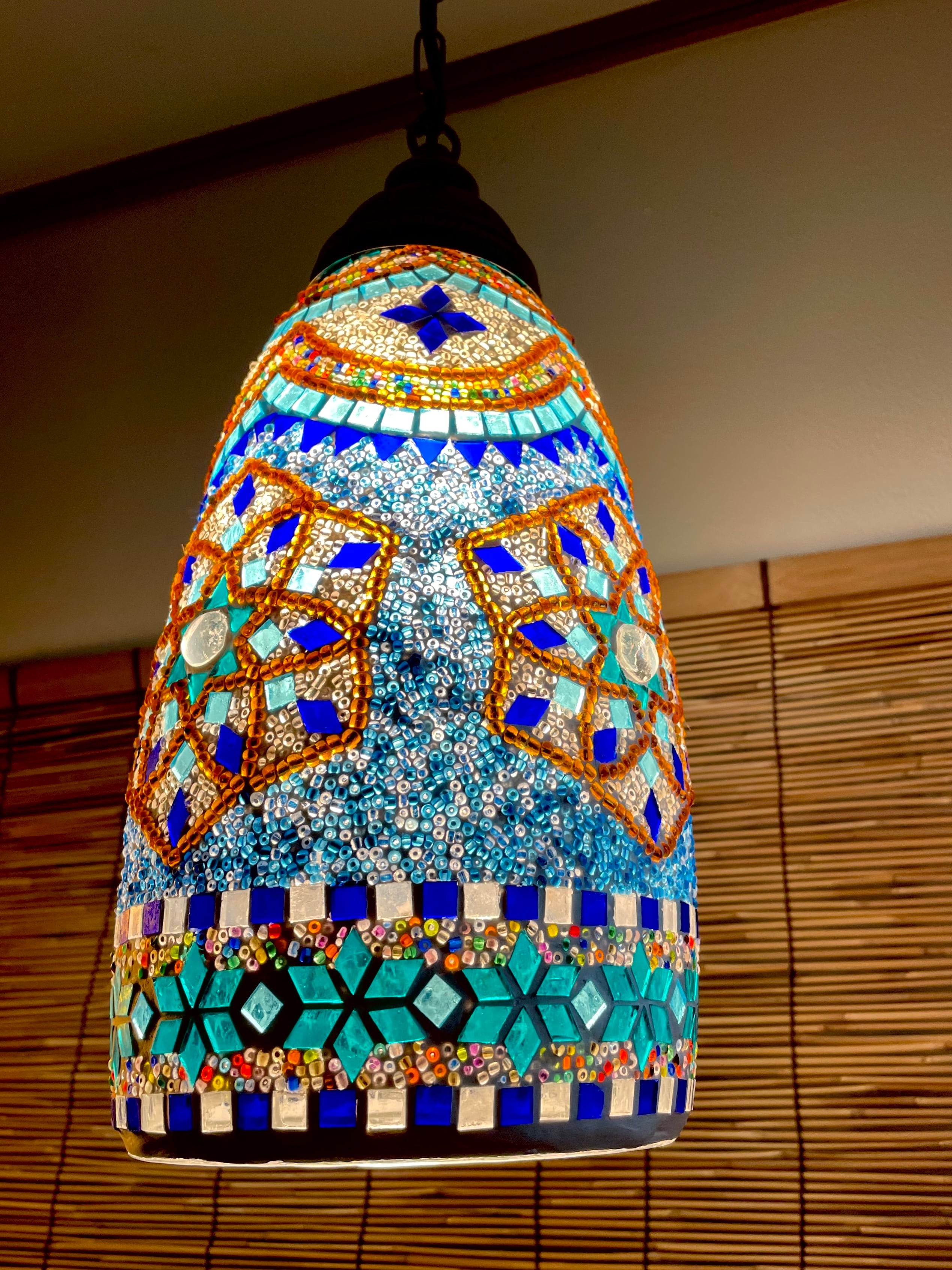 つりがねのような形の大きなホヤに、大きく花をイメージしたモチーフをいれ、綺麗な青いランプに仕上げました。カラフルのビーズがアクセントになっています。デザインにこだわり細かく丁寧に仕上げました。お家のインテリアのアクセントにいかがですか?☆
